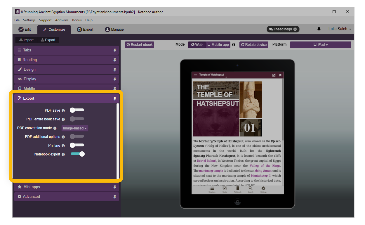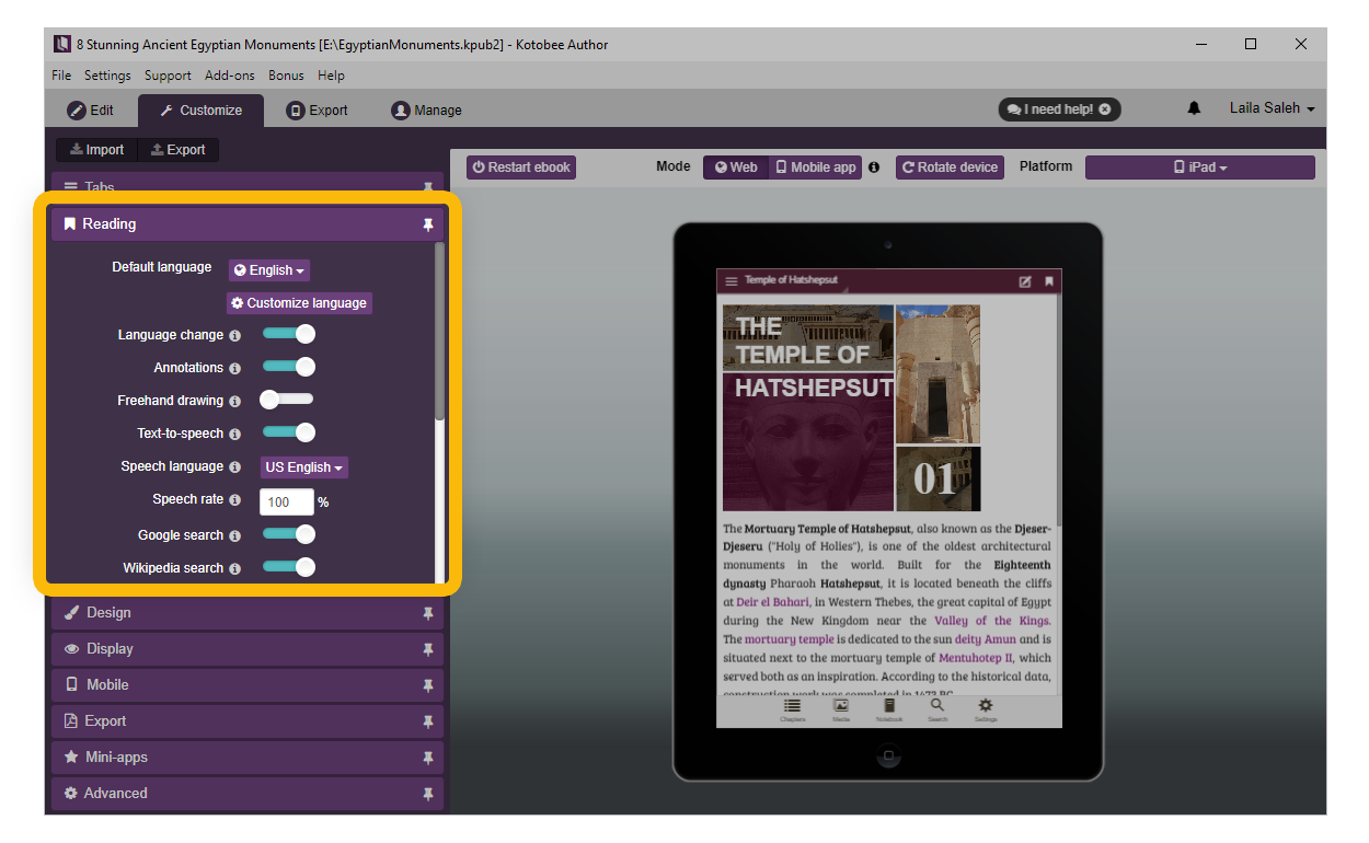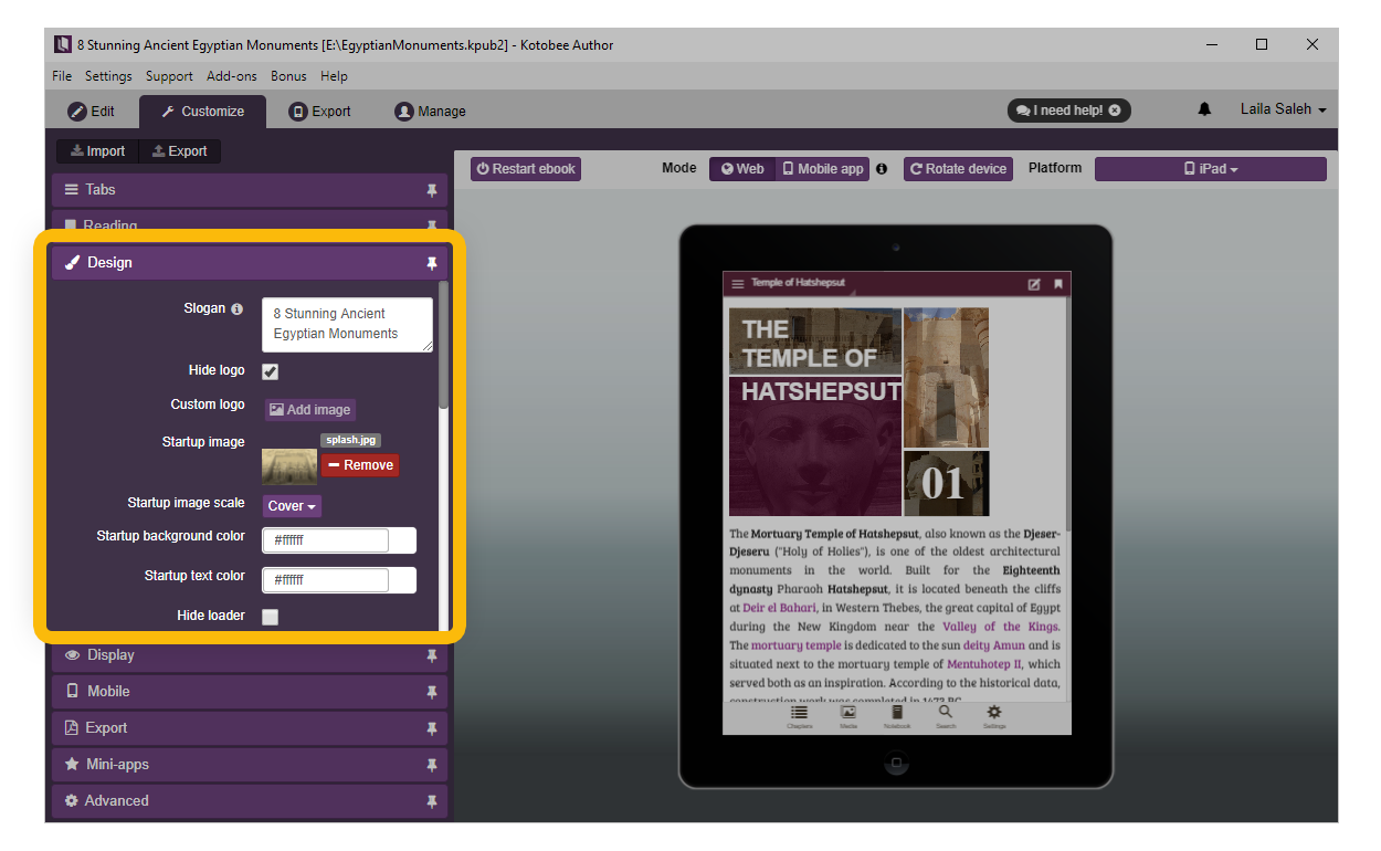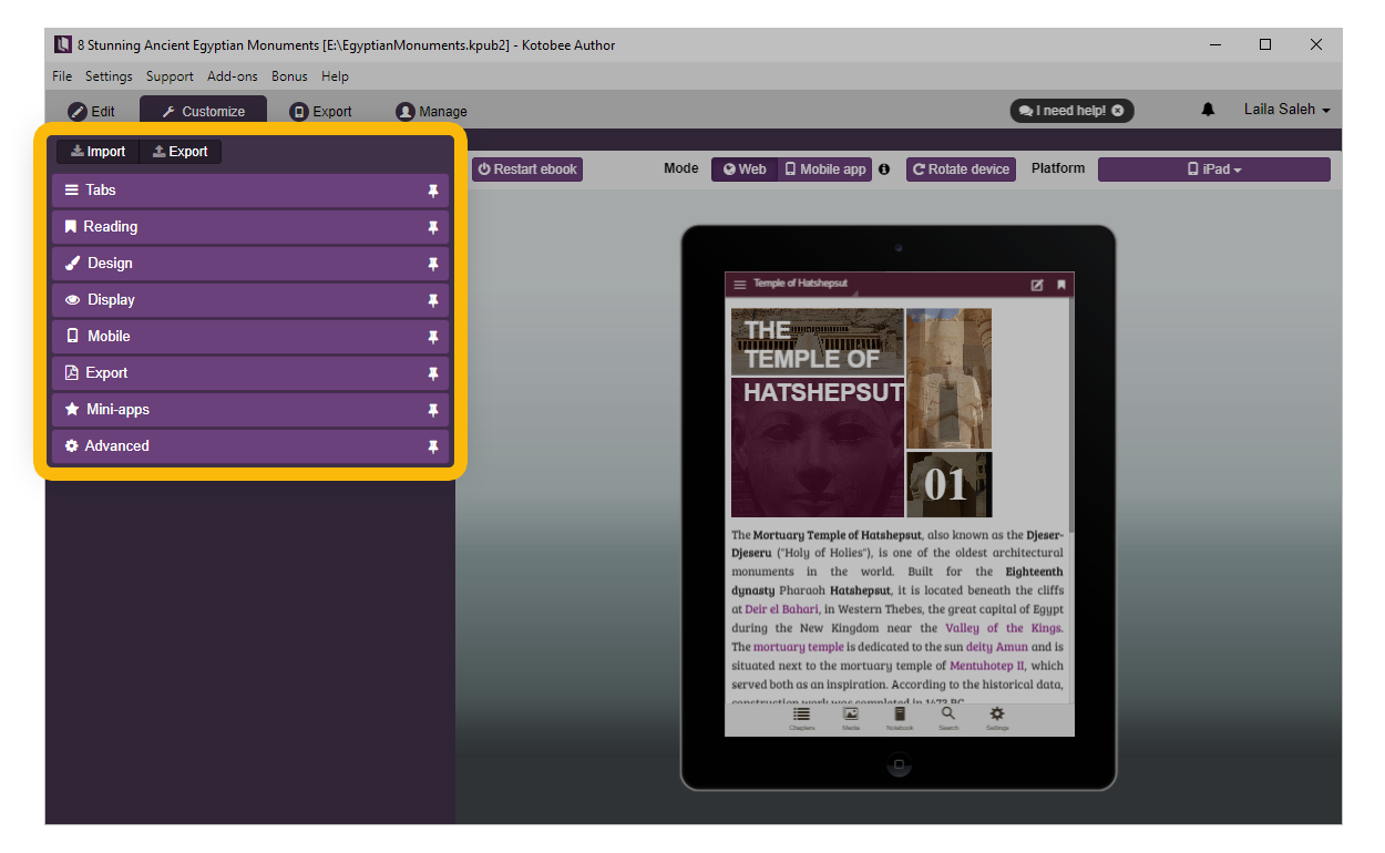 In the Edit Screen, you wrote and designed your ebook. In the Customization Screen, you will design and customize your ebook as a web app, desktop app, mobile app, or hosted ebook. You can change the app's appearance, language, features and control bar.