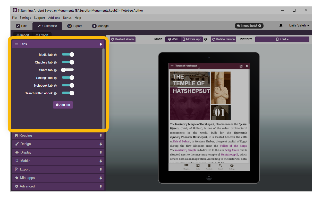 To get to the Customize screen, click on the Customize tab in the upper left corner of the Kotobee Author window.