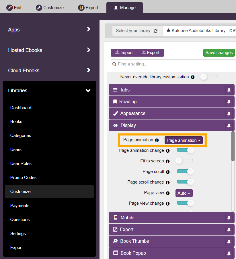 Learn how to set the page animation in your library app. Kotobee Reader provides four ways for your pages to turn.