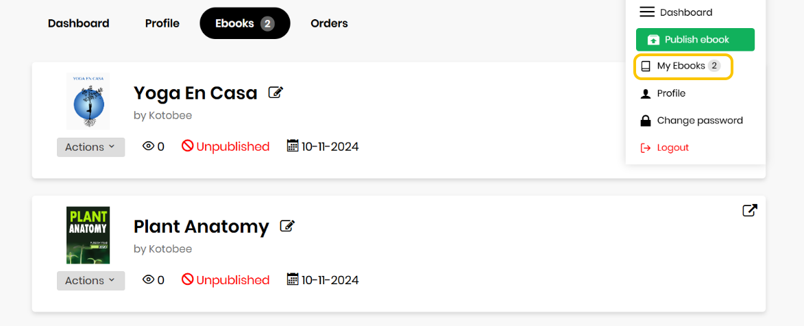 Once your ebook is published on Kotobee Books, you might want to make updates to the content, metadata, or pricing.