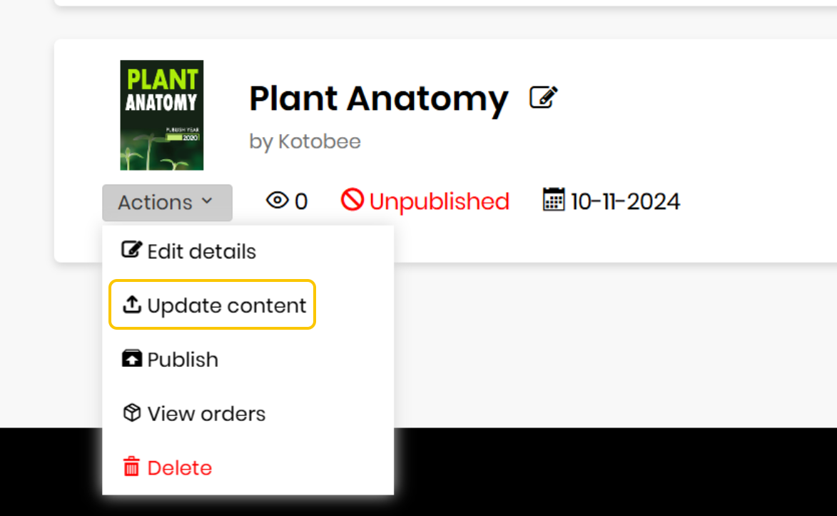1. To update the ebook content, click on the ‘Actions’ button for the ebook you’d like to update, then select ‘Update content’ from the drop-down menu.